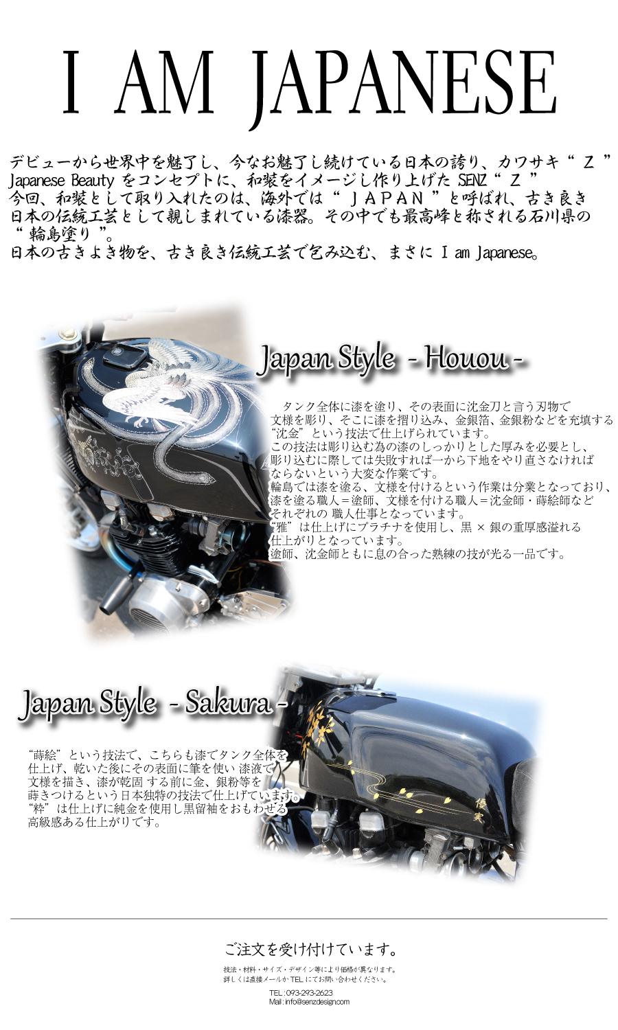I AM JAPANESEデビューから世界中を魅了し、今なお魅了し続けている日本の誇り、カワサキ “ Z” Japanese Beauty をコンセプトに、和装をイメージし作り上げた SENZ “ Z ”